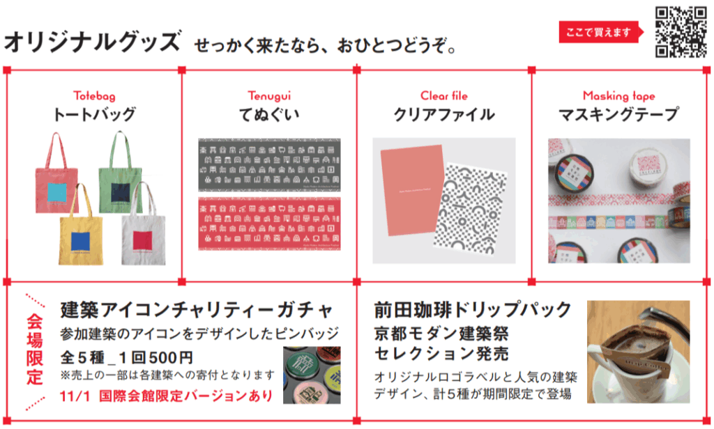 トートバッグ、てぬぐい、クリアファイル、マスキングテープのほか、建築アイコンピンバッジ(チャリティーガチャ)や前田珈琲コラボのドリップパックセットなど、建築祭限定アイテムが勢ぞろい!